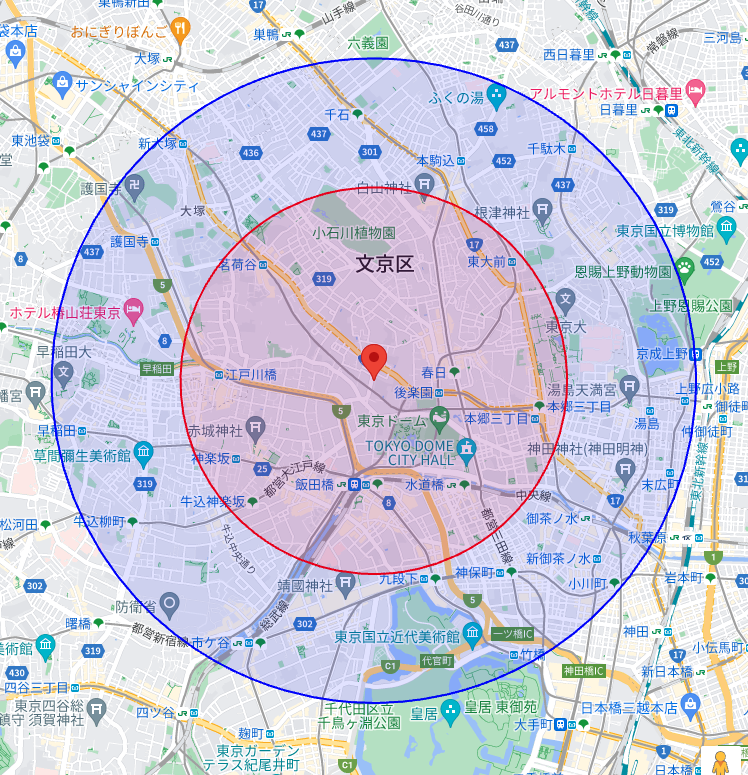 ※ 送迎可能範囲はお店から直線距離1.5km(概ね3km/赤枠)、最大で直線距離2.5km(概ね5km/青枠)までとなっております。(距離はGoogleMap検索での距離換算となります。)送迎可能範囲内かどうか知りたい場合につきましてはスタッフまでお気軽にお問い合わせください。